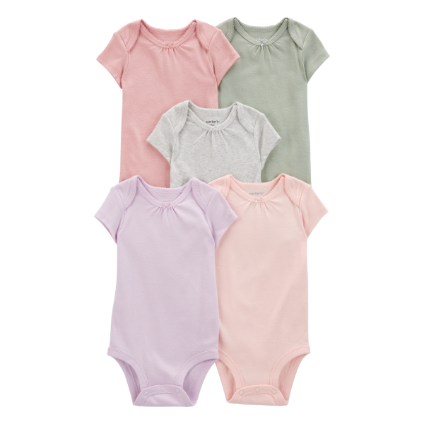 Set de 5 bodies de algodón 100%, suaves y cómodos, perfectos para la piel del bebé. Diseñados con broches inferiores para cambios rápidos y en colores básicos que combinan fácilmente. Ideales para el día a día y fáciles de lavar.
