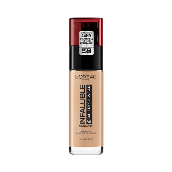 Base de maquillaje de larga duración y acabado natural para una piel perfecta todo el díaTono 460 Golden Beige.Alta cobertura, resiste agua y no se transfiere.Con tecnología de piel transpirable, LOreal Paris Fresh Wear.Esta base liviana hace que la piel se sienta hidratada y cómoda por hasta 24 horas.Experimenta el poder de permanencia durante todo el día de la nueva base Fresh Wear.La base transpirable se aplica suavemente para una tez de aspecto saludable.SPF 25 para proteger, no comedogénico y apto para todo tipo de pieles.El color se mantiene fiel y se difumina uniformemente, por lo que tu maquillaje luce fresco todo el día.