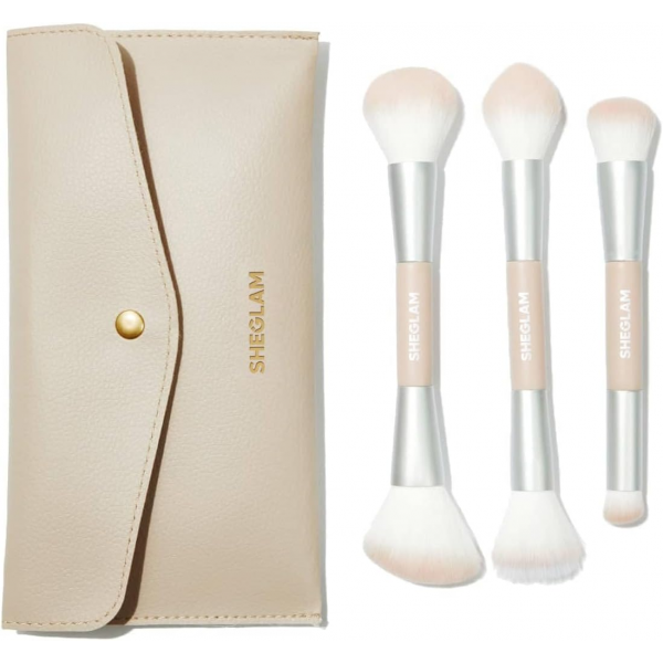 El Sheglam Glam 101 Set de Brochas Esenciales para Rostro con Bolso es una opción elegante y funcional para quienes buscan herramientas de maquillaje de calidad a un precio accesible. Este set incluye tres brochas de doble cara, diseñadas para aplicar base, corrector, contorno, rubor e iluminador.